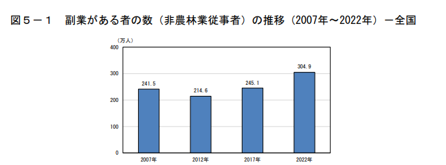 ・副業を持つ人は305万人に達し、5年前に比べ約60万人も増加