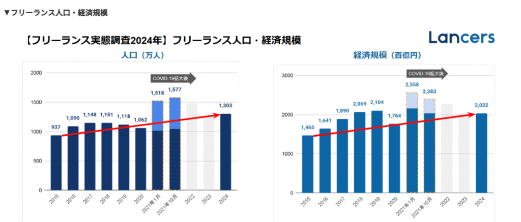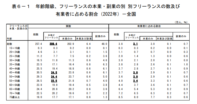 こちらの資料における対象となるフリーランスは「一度でも会社に所属せず、個人で仕事を請け負った経験がある人」「副業としての個人業務を含む人たち」を広くカウントした数だそうです。